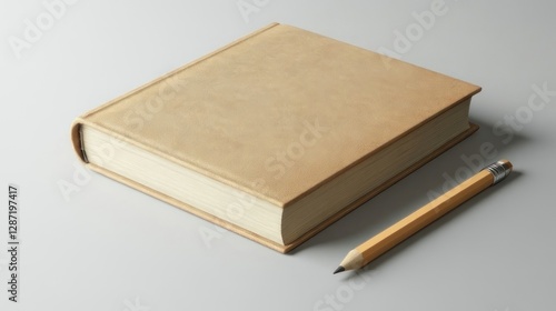 Beige book and pencil on light gray surface