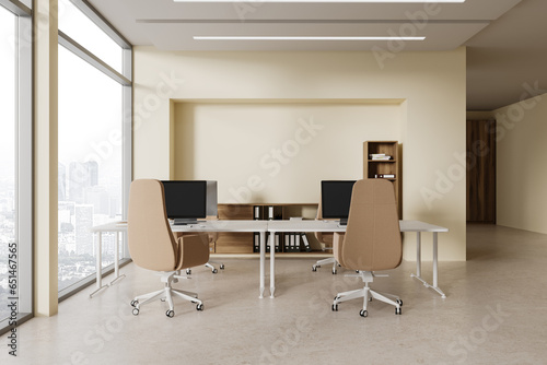 interior, office, workspace, business, furniture, design, loft, three-dimensional, workplace, room, work, zone, armchair, desk, row, shared, table, shelf, computer, monitor, desktop, modern, chair, hallway, panoramic, paris, city, view, skyscraper, team, teamwork, render, rendering, illustration, technology, beige, concrete, floor, style, stylish, marketing, law, finance, minimalist, indoor, architecture, no people