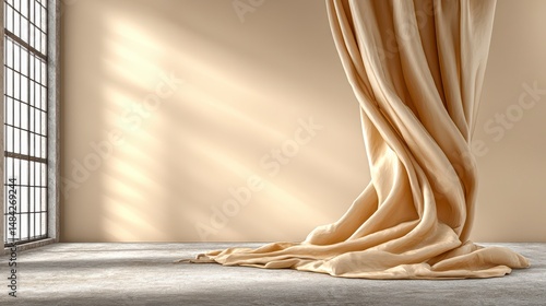 beige, drape, fabric, curtain, textile, floor, concrete, minimalist, interior, design, sunlight, shadow, light, room, space, studio, photo, background, texture, elegant, sophisticated, style, modern, contemporary, aesthetic, presentation, product, display