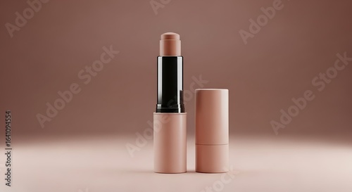 Beige lipstick with a cap on a beige background in studio shot