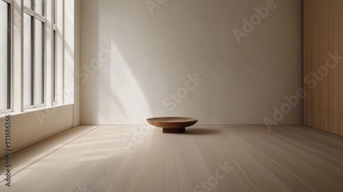 Beige oak floor meeting a light wall in a minimalistic room, creating a serene, neutral space with empty floor area.
