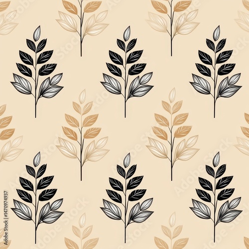 Beige Seamless Pattern with Black and Gold Stylized Leaf Sprigs