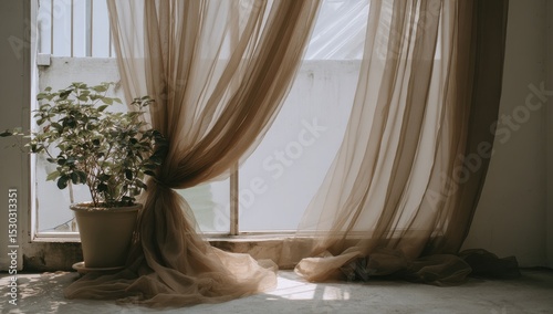 window, curtain, sheer, beige, light, plant, pot, sunlight, indoor, room, decor, natural, soft, gentle, warm, calm, peaceful, minimalist, simple, elegant, cosy, texture, drape, flowing, shadow, floor, concrete, modern, home, design, still, life, daylight, interior, neutral, aesthetic, style, empty, sharpened
