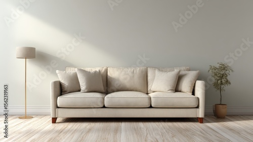 Beige sofa against white, empty wall with copy space in simple living room interior with lamp, no logos, no brands