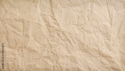 Beige wrinkled paper sheet. Aged texture surface design. Decorative layer. Empty space.