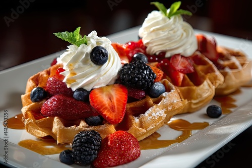 Belgian waffles topped with syrup, whipped cream, and fruit, plated elegantly