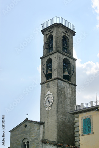 Bell tower of the church of St. Jacopo and Antonio against a blue sky with clouds in Fivizzano, the small Lunigiana town in the province of Massa and Carrara, Tuscany, Italy