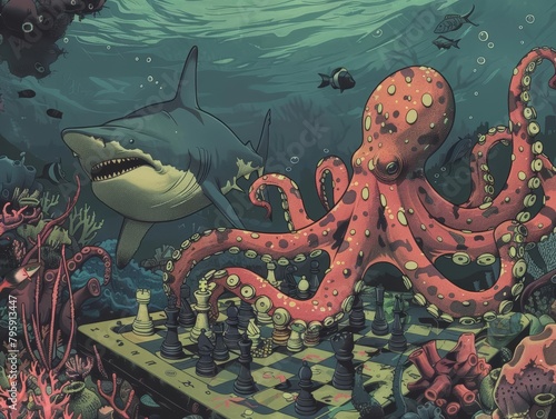 Beneath the oceans surface, a quirky octopus in a retro cartoon style plays chess with a friendly shark, surrounded by whimsically drawn coral and fish