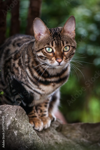 bengal, brown, charcoal, dark, contrast, spotted, bengal cat, sitting, tree, hiding, shallow dof, bokeh, domestic cat, garden, spring