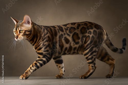 bengal cat, felino, pet, animal, spotted, brown, black, beige, sleek, elegant, walking, studio shot, mammal, pedigree, purebred, half face, whisker, short hair, muscular, athletic, graceful, alert, attentive, indoor, animal portrait, domestic cat, brown background
