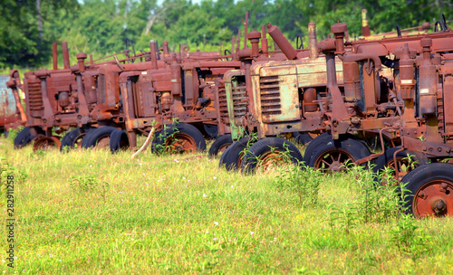 rust-eaten, antique, tractor, agriculture, farming, equipment, farm equipment, rusting, old, vintage, orange, field, outdoors, row, bunch, group, weathered, worn, metal, wheel, engine, fender
