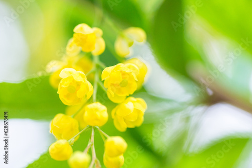 Berberis vulgaris, simply barberry Yellow flowers. Buds cluster on blooming Common or European Barberry in spring