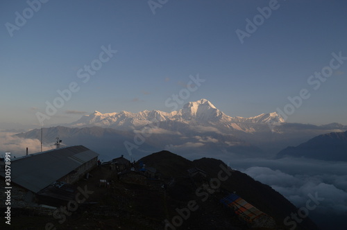 Berggipfel des Annapurna über den Wolken - Himalaya Berghütte im Sonnenaufgang mit Blick auf den Poon Hill, Famous Ghorepani Sunrise Trekk