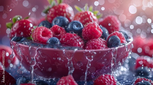 Berry Explosion: A bowl overflowing with fresh berries like strawberries, blueberries, and raspberries, set against a bright and colorful background, capturing the freshness and sweetness of summer