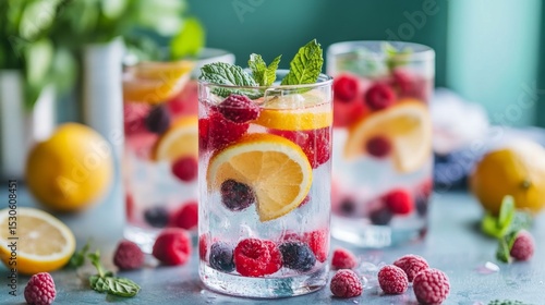 Berry infused water in clear glass with mint and citrus, styled for summer wellness