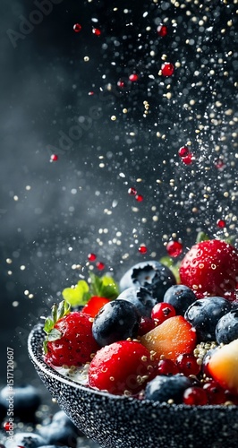 berry, blueberry, strawberry, raspberry, redcurrant, health food, healthy breakfast, fruit salad, healthy eating, food photography, fresh fruit, morning meal, gourmet food, organic food, vegetarian food, splash, motion blur, dark background, studio shot, delicious, appetising, tasty, receipe, fruit bowl, healthy lifestyle, artistic