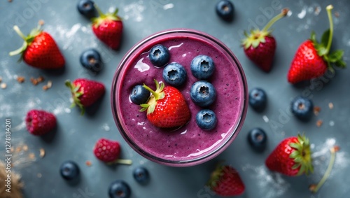 Berry smoothie with strawberries and blueberries in a glass on a blue background garnished with fresh fruits