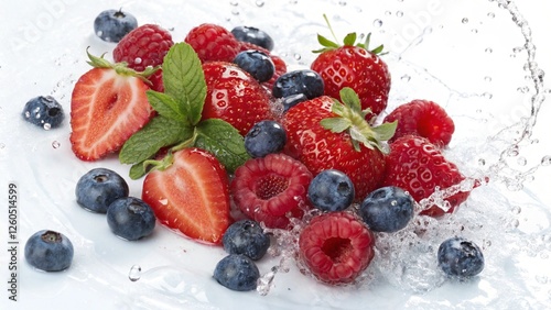 Berry Splash: A vibrant mix of fresh strawberries, raspberries, and blueberries, glistening with water droplets, creates a dynamic and delicious image.