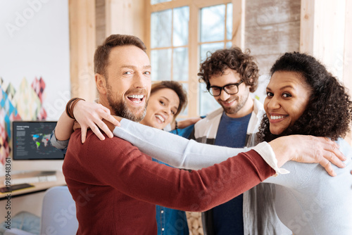 Best friends. Attractive joyful young employees smiling and hugging each other while being in the office