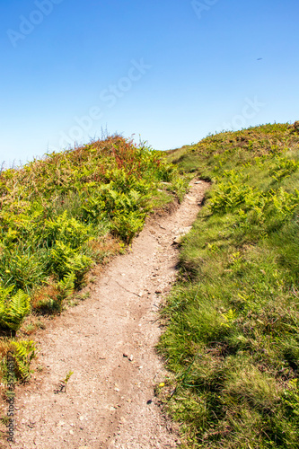 landscape, path, pedestrian, walk, afoot, seafront, panorama, coast, point, cliff, raised, rock, water, heaven, cloud, blue, berry, horizon, colours, beauty, sea, turquoise, reserve, cornwall, brittany, france, tour tourism, travel, hike, calm, cove, scenic