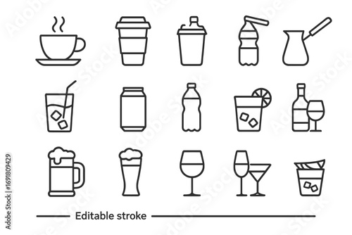 drink, beverage, icon, vector, set, line, outline, symbol, hot drink, tea, water, soda, juice, cocktail, wine, beer, alcohol, cup, glasses, bottle, can, mug, editable, stroke, menu, cafes, bar, eatery, minimal, simple, pictogram, graphic, isolated, signs, liquid, refreshment, espresso, latte, shaker, whiskey, party, collection, infographic, app, web