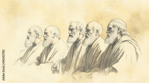 Biblical Illustration of Numbers: Elderly Levites Sharing Wisdom with Younger Ones After the Dedication Ceremony, Captured on a Beige Background, Emphasizing Mentorship and Religious Tradition