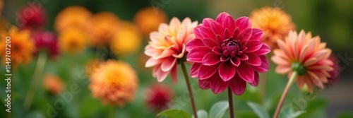 Bicolor Dahlia in a garden with vibrant autumn colors, fall flowers, seasonal flowers