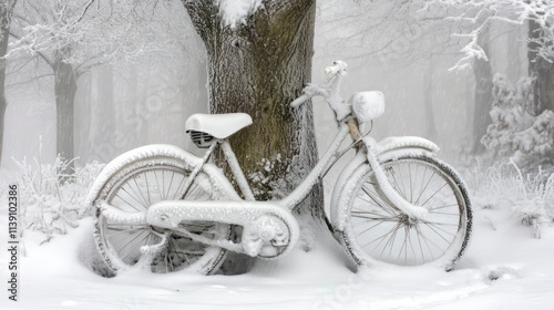 bicycle, snow, winter, tree, cold, transport, nature, outdoors, quiet, landscape, frost, white, season, weather, stillness, scenery, abandoned, environment, calmness, bike, cycle, beauty, wilderness, chilly, snowflake, scene, glacé, peaceful, coldness, rural, winter storm, calm, still, icy, foliage, fog, harmony, solitude, nostalgia, monochrome, solitary, vehicle, tree, winterly, photo