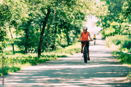 road, route, trail, bicycle, active, young, nature, outdoors, green background, sunny, riding, smiling, horizontal, bicycling, travel, sport, lifestyle, park, recreation, green, orange, yellow, helmet, summer, people, activity, well-being, healthy lifestyle, physical activity, adult, fun, exercising, warm, sunlight