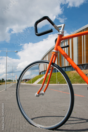 big, racing, bike, bicycle, orange, building, velodrome, holland, holland, apeldoorn, architecture, street, enormous, giant, sporting, light, pole, sunny, sunshine, summer, nobody