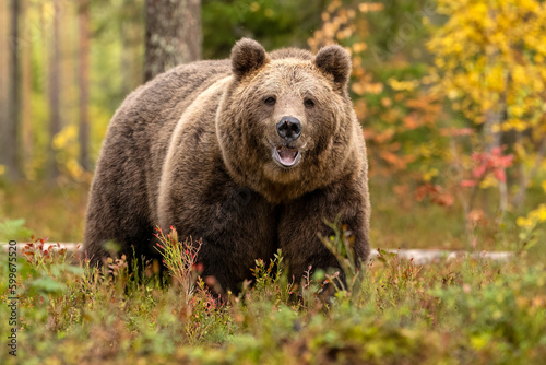 strong, ursus, brown, bear, brown bear, grizzly, forest, autumn, fall, massive, powerful, large, carnivore, predator, nature, wild, wildlife, male, adult, threat, danger, landscape, colourful, tree, background, old, european, europa, nordic, wilderness, habitat, glance