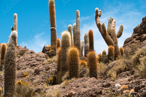 ancient, giant, cactus, forest, famous, island, uyuni, salt, flat, bolivia, nature, outdoors, plant, desert, heat, sunny, day, blue, sky, landscape, wild, needle, scenery, dry, survival, landmark, travel, america