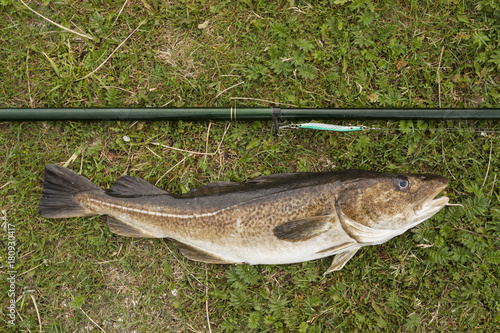 Big cod fish and a fishing rod with a green lure