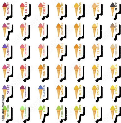 ice, cream, ice cream, gelato, graphic, sticker, popsicle, sorbet, food, sweet, dessert, taste, ball, waffle, wafer, scoop, cone, raspberry, cherry, banana, apple, strawberry, hot drink, orange, coconut, watermelon, pineapple, vanilla, lemon, pistachio, summer, eskimo, sherbet, sundae, fruity, chocolate, isolated, set, collection, assortment, portion, label, logotype, magnet, icon, patch, illustration, emblem