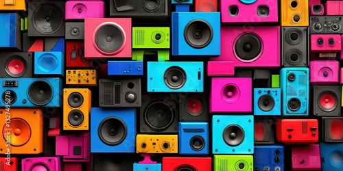 Big colorful speaker boxes - boxed audio woofers, subwoofers, mid-range, and tweeters for a full audio experience
