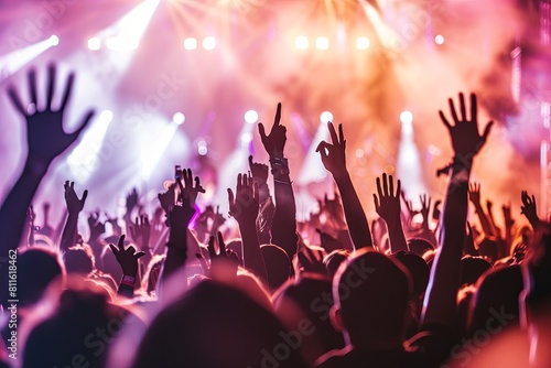 Big crowd of people having fun at concert, hands up and enjoying music performance on stage with bright lights and smoke in the background.
