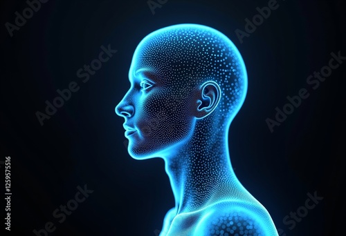 Big Data AI Face: 3D Render of Abstract Light Blue Man Face on Black, Symbolizing Artificial Intelligence, Cyber Security, and Digital Transformation Concepts.