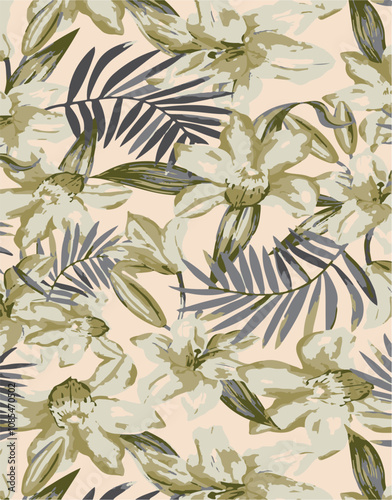 Big flowers pattern, upscale floral pattern. graphical textures floral, trendy colors pattern , flowers background with leaves. vector illustration.