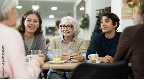 Big friendly family talking over dinner in modern restaurant