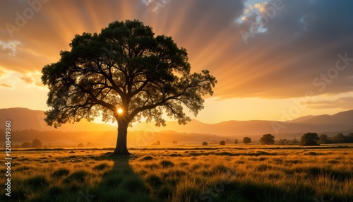 Big oak tree stands in golden sunlight. Autumnal rural scene. Sunlight rays shine through tree canopy. Calm, peaceful. Nature background. Majestic tree silhouette against warm sky. Healthy flora in