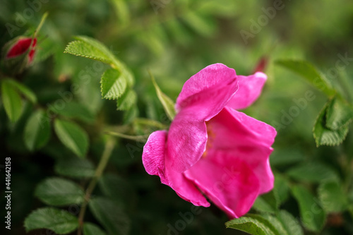 Big pink wild rose flower on the green branch in the green natural background, pink rosehip flowers, macro