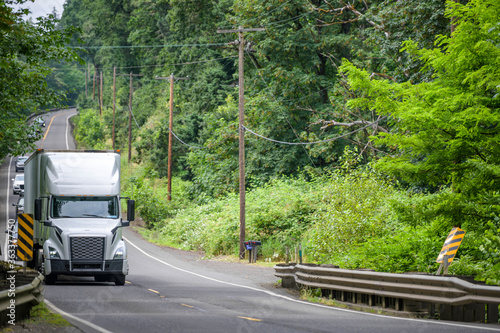 Big rig white semi truck with dry van semi trailer go downhill in front of another car traffic on the winding forest road
