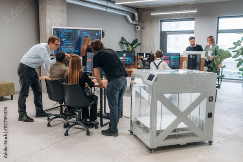 Big screen with code on the wall. People are in the office by the 3d printer