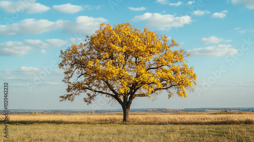 Big Tree with Yellow Leaves at Hungarian Countryside: A large tree with yellow leaves set against the Hungarian countryside in fall.