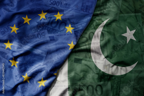big waving realistic national colorful flag of european union and national flag of pakistan on a euro money banknotes background.