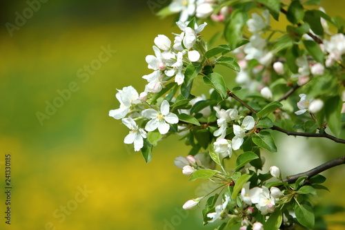 Big white cherry blossoms in the morning spring sunshine on a background of yellow-green meadow.