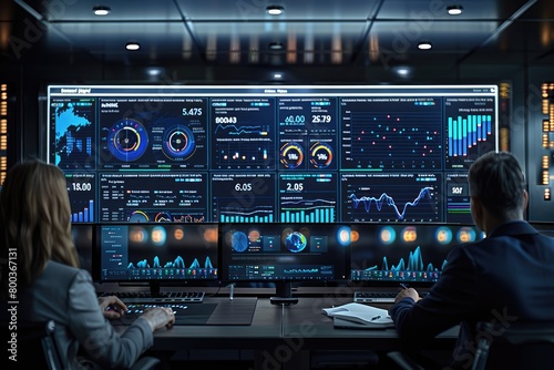 big widescreen monitor with charts and management dashboard in front of office desk professional photography
