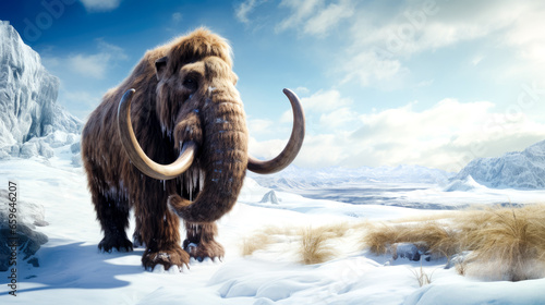 big, mammoth, extinct, mammal, elephant, animal, illustration, tusk, nature, wildlife, snow, winter, color image, pleistocene, vertical, history, huge, no people, large, wild, animal themes, paleontology, trunk, day, ice age, ai, era, fossil, power, predator, strength, hunting, pachyderm, wilderness, eurasia, fur, prehistoric, fauna, herbivorous, ice, woolly, lake, generative, past