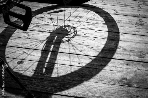 bike shadow on old wood texture, front and background blurred with bokeh effect