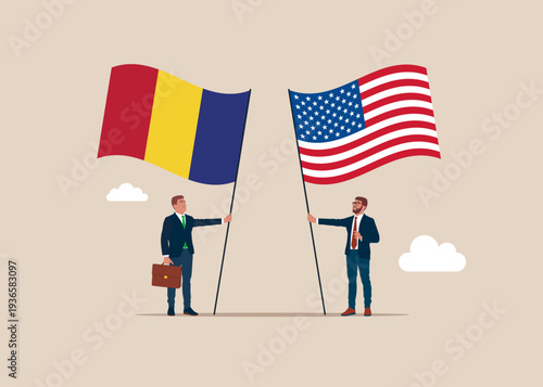 Bilateral political relations. Two flags of friendship. Businessmen united between Romania and its friendly countries United States of America. Flat vector illustration.